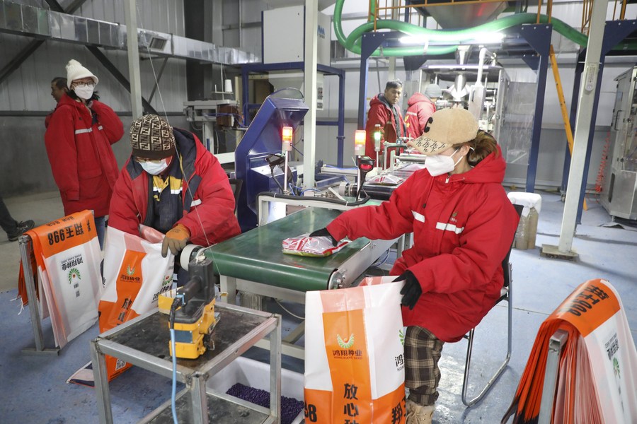 吉林省公主嶺市鴻翔種業(yè)的工作人員在生產(chǎn)車間內(nèi)分袋打包玉米種子產(chǎn)品(2月1日攝)。新華社發(fā)