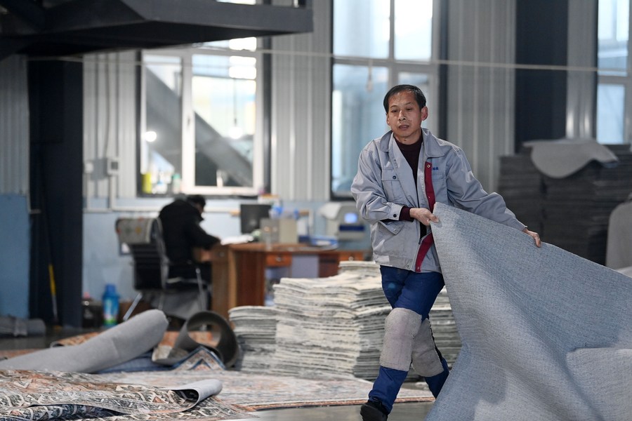 在天津市武清區(qū)崔黃口鎮(zhèn)凱利地毯有限公司,工人搬運(yùn)地毯(2月1日攝)。新華社記者 李然 攝
