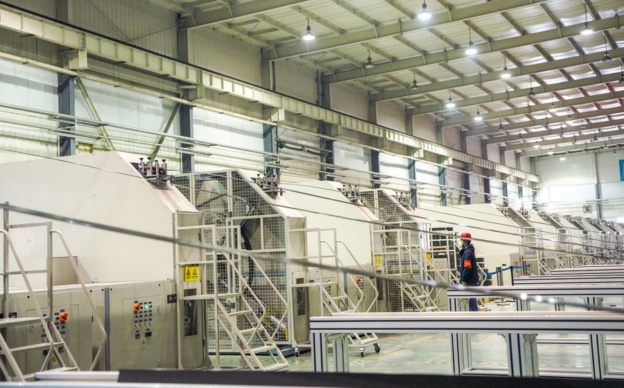工人在吉林化纖集團(tuán)吉林國興復(fù)合材料有限公司拉擠車間工作(1月31日攝)。新華社記者 顏麟蘊(yùn) 攝
