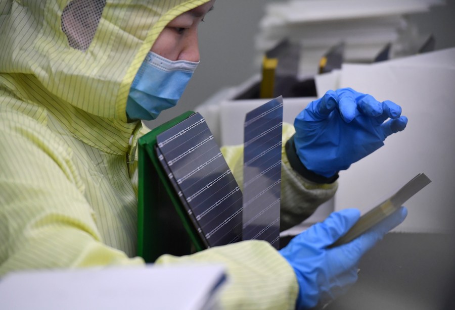 2月2日,檢驗(yàn)人員在隆基綠能高陵電池工廠檢查電池片。新華社記者 邵瑞 攝