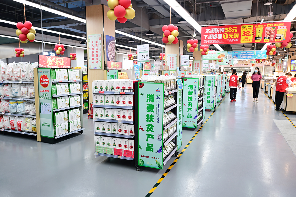【記者高春頎北京報(bào)道】7月28日,在北京市國(guó)資委、市商務(wù)局、市委網(wǎng)信辦、市總工會(huì)、市扶貧支援辦、豐臺(tái)區(qū)政府主辦的“北京消費(fèi)扶貧月暨市管國(guó)企消費(fèi)扶貧月”活動(dòng)上,物美集團(tuán)與首農(nóng)食品集團(tuán)共同打造的北京首家扶貧超市——物美草橋雙創(chuàng)中心店正式開業(yè)。超市位于北京消費(fèi)扶貧雙創(chuàng)中心一層,重點(diǎn)推廣來自全國(guó)各地扶貧商品和北京對(duì)口扶貧地區(qū)7省91縣商品,將帶動(dòng)幫扶地區(qū)建檔立卡貧困戶30717戶增收脫貧。